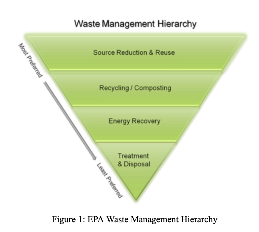 However, from a material/resource standpoint, counterarguments state that actual recycling should result in the beneficial reuse of the solid waste, cradle-to-cradle/circularity, as well as reduce carbon release. This argument supports the overall movement into a circular economy. The EPA gave statements regarding the hierarchy of recycling (Fig. 1). Within this hierarchy, energy recovery is the second to last alternative for waste and does not count as waste minimization, which would be the top two tiers. With these considerations WTE is not “environmentally sound recycling”. Additionally, the number of WTE facilities has decreased over the past few decades as public opinion around the environmental impacts of the plants worsened. The impacts relate mostly to air quality issues caused by the combustion of MSW, not just from GHG emissions (CO2/CH4) but also trace minerals and other harmful substances (ACS Publications 1978 (4)). As such, some states such as CA are passing regulations on how much waste can be sent to WTE and count towards waste diversion minimums ( California AB 1857 & SB 54).
